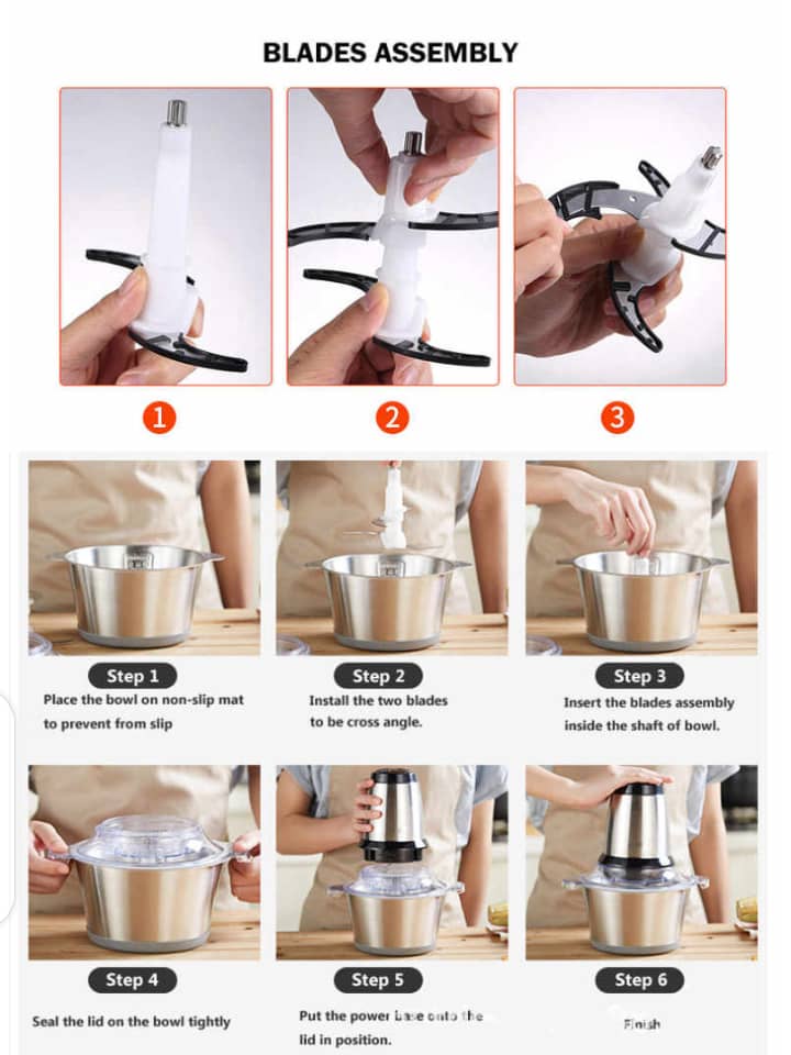 (1) Put the blades in the bowl. (2) Add whatever you want to grind or pound( yam, pepper, tomatoes etc ). (3) Press the button at the top of the machine and wait for 1-2 minutes while it grinds or pounds.(4) Open it and pack it out.